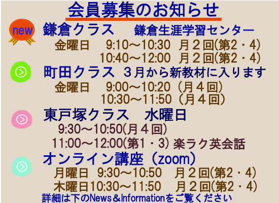 - 東戸塚クラス 会員募集!東戸塚クラスの会員を募集しています。 水曜日 9:30~10:50(東戸塚駅東口より徒歩4分)皆で楽しく学習し… 続きを読む: 東戸塚クラス 会員募集!