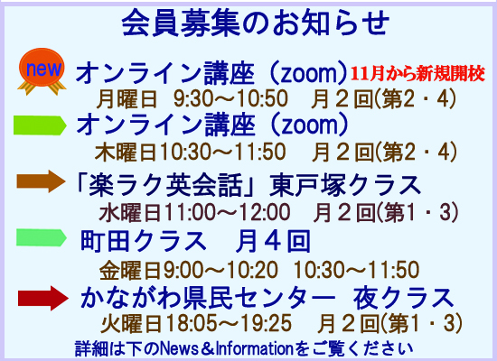 - 「楽ラク英会話」東戸塚クラス 会員募集します「楽ラク英会話」東戸塚クラスの会員を募集しています。 第1・第3水曜日 11:00~12:00(月2回) (東… 続きを読む: 「楽ラク英会話」東戸塚クラス 会員募集します