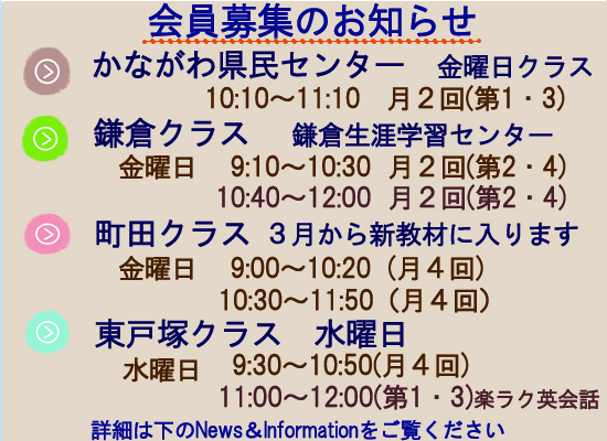 - 東戸塚クラス 会員募集!東戸塚クラスの会員を募集しています。 水曜日 9:30~10:50(東戸塚駅東口より徒歩4分)皆で楽しく学習し… 続きを読む: 東戸塚クラス 会員募集!